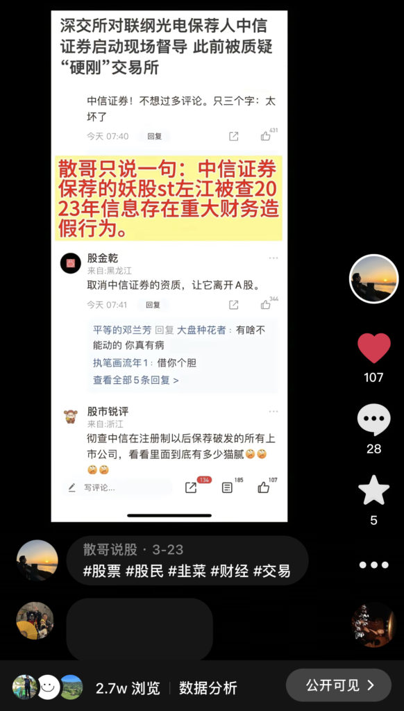 但这两天散哥还是没忍住,将矛头对准了市场内最大的头部券商中信证券,其他方面散哥不想评论,但是被它保荐的妖股ST左江,不但创造了ST股的最高价,而且也创造了最快的跌幅记录,一度从最高300块跌到现在的只有17块,问题是还被发现2023年披露的财务数据存在造假行为。