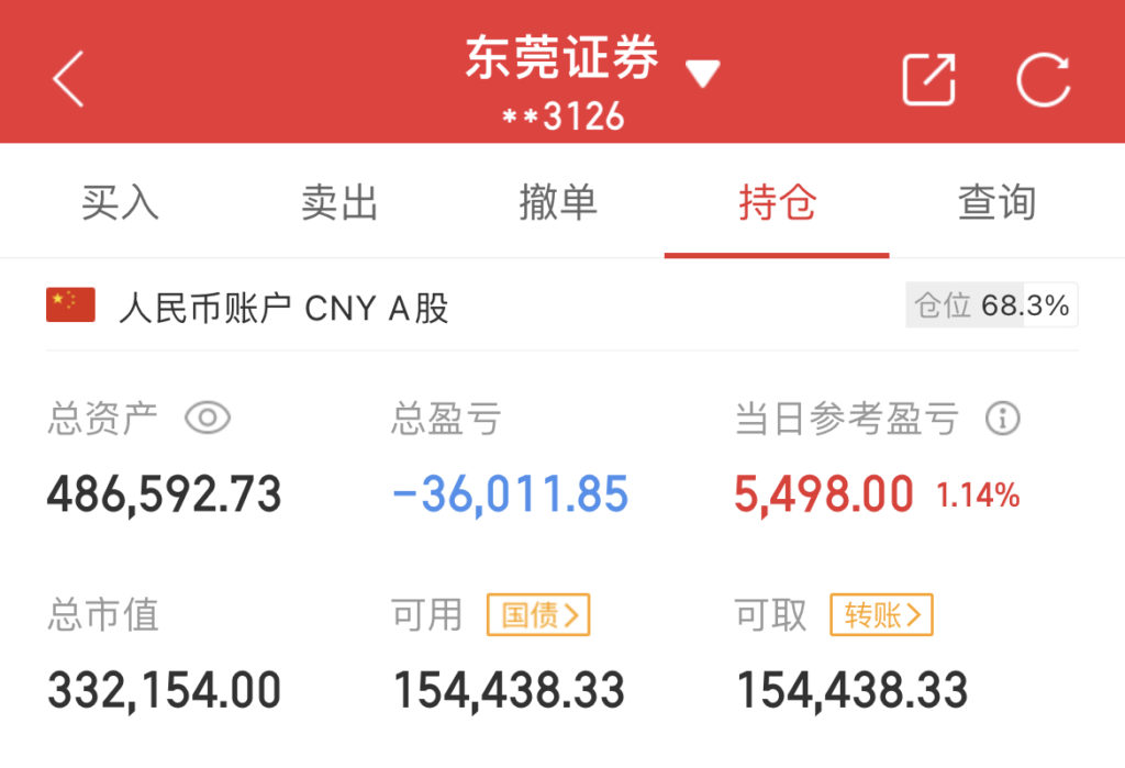 账户总资产486592元,累计入金500000元,当日浮盈5498元,累计浮亏13408元;账户目前持有市值332154元,持有股票11只,仓位加至7成左右,具体账户信息如图所示: