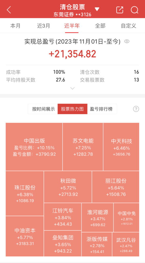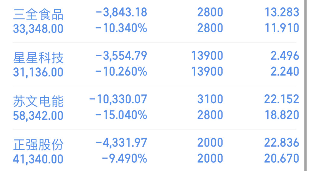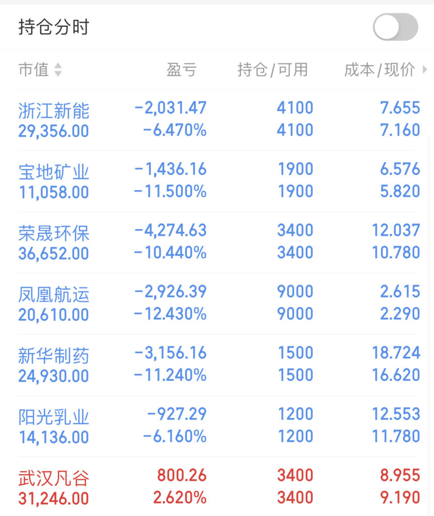 当日账户持有三全食品、荣晟环保、浙江新能、武汉凡谷、正强股份、凤凰航运、新华制药、星星科技、阳光乳业、宝地矿业、苏文电能等11只股。