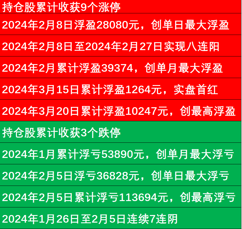 截止今天,实盘自开通以来连涨、连跌、涨停、跌停、浮盈/浮亏纪录如下: