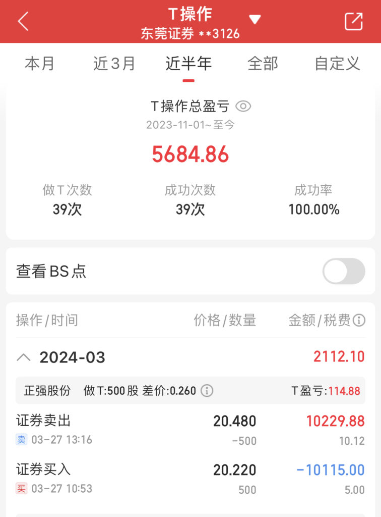 截止当日,散哥累计完成做T操作39次,实现投资收益5684元。