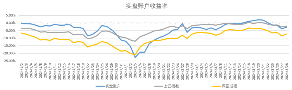 截止今日收盘,账户开户至今收益率为-2.68%,同期上证指数和深证成指收益率分别为-2.02%和-7.29%,实盘账户分别跑输上证指数0.66%、跑赢深证指数4.61%。
