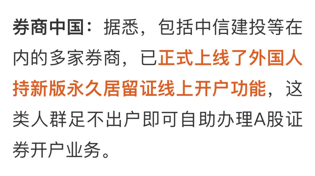 今天散哥关注到一个新闻,可能很多人前面就已经关注到,说是有头部券商已经开始内测外国友人通过居留证办理证券开户业务。