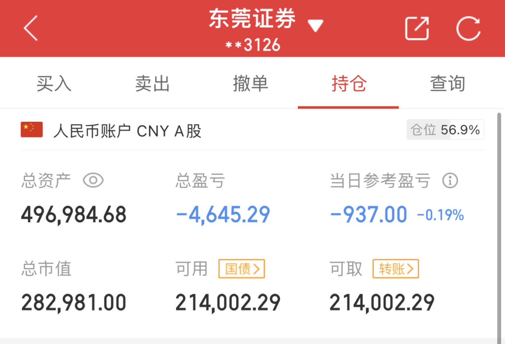 账户总资产496984元,累计入金500000元,当日浮亏937元,累计浮亏3016元。
