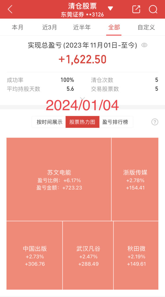 截止当日,散哥累计完成清仓5次,实现投资收益1622元,清仓胜率100%。