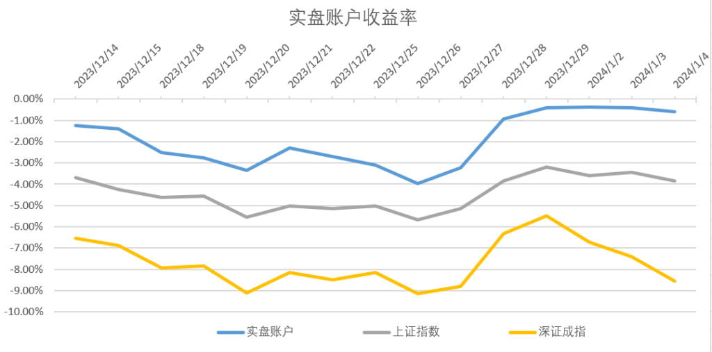 截止今日收盘,账户开户至今收益率为-0.60%,同期上证指数和深证成指收益率分别为-3.86%和-8.56%,实盘账户跑赢上证指数3.25%、跑赢深证成指7.96%。