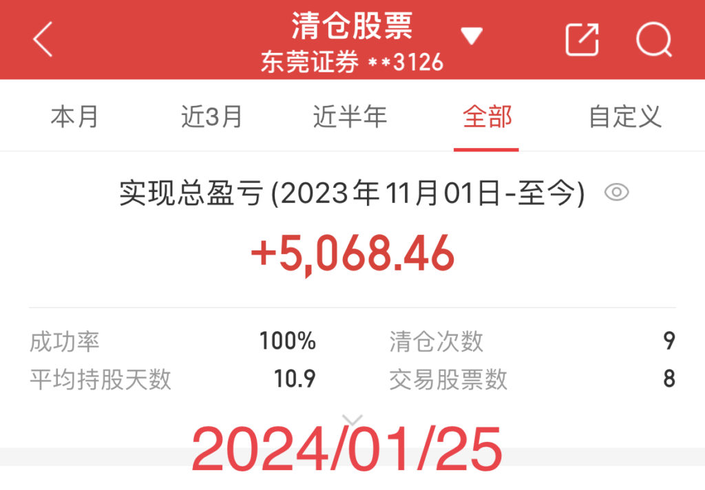 截止当日,散哥累计完成清仓9次,实现投资收益5068元,清仓胜率100%。