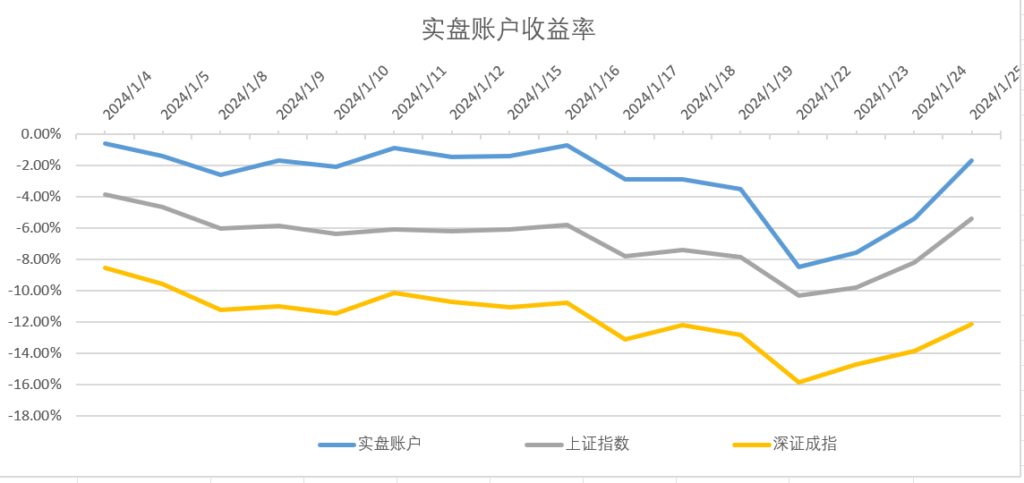 截止今日收盘,账户开户至今收益率为-1.67%,同期上证指数和深证成指收益率分别为-5.43%和-12.12%,实盘账户跑赢上证指数3.75%、跑赢深证成指10.45%。