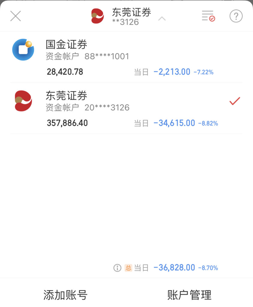 账户总资产386306元,累计入金500000元,当日浮亏36828元,累计浮亏113694元;账户目前持有市值385905元,持有股票18只,具体账户信息如图所示: